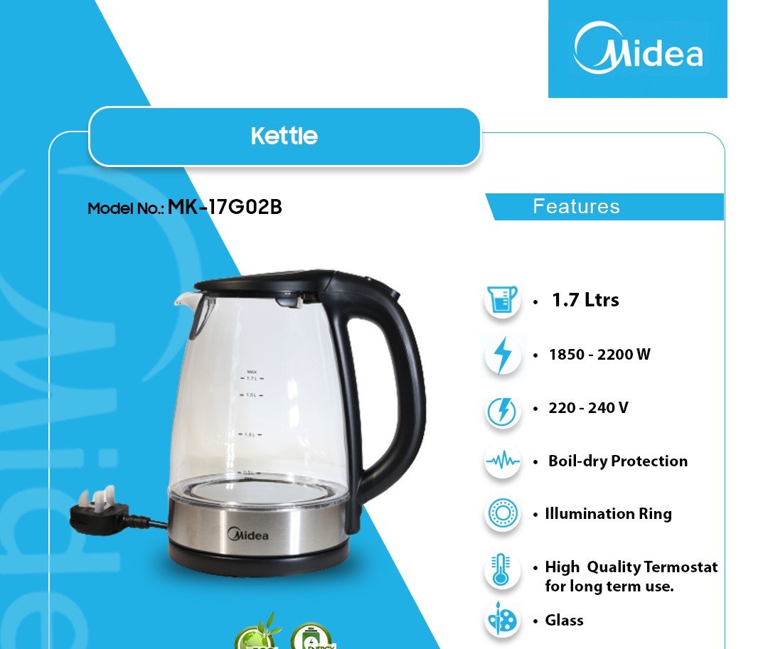 MIDEA ELECTRIC KETTLE TRANSPARENT GLASS 1.7L MK-17G02B – Boil Water in Style and Speed!
