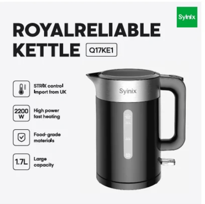Looking for a reliable and affordable electric kettle that gets the job done without compromising on style? The Syinix 1.7L Electric Kettle (Q17KE1 – Single Plastic Black & White) is the perfect addition to your kitchen or office. With its sleek two-tone design and powerful performance, this kettle combines practicality with everyday convenience.