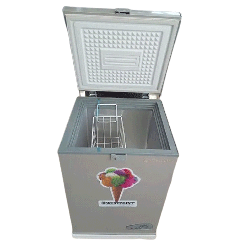 Westpoint 100L Chest Freezer WBFL-1123 is a compact, silver-colored, energy-efficient appliance for freezing food, featuring a top-opening lid, one storage basket, and an aluminum-coated interior, designed to offer reliable cooling with features like fast cooling and space-saving for homes or small businesses.Â